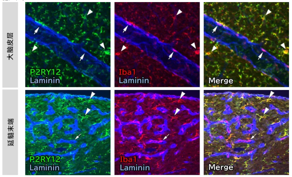 P2RY12(也稱為P2Y12)是一種腺苷5'-二磷酸(ADP)受體,也是嘌呤能G蛋白偶聯受體P2Y家族的成員。它在外周組織的血小板中表達,也在中樞神經系統的穩態小膠質細胞(Homeostatic Microglia)中特異性表達。由于P2RY12幾乎不在巨噬細胞中表達,所以它是用于區分存在腦血管周圍的巨噬細胞和小膠質細胞的有效標志物1)。此外,ADP可用作細胞損傷的信號,小膠質細胞中的P2RY12被認為在接收神經細胞損傷方面發揮作用。